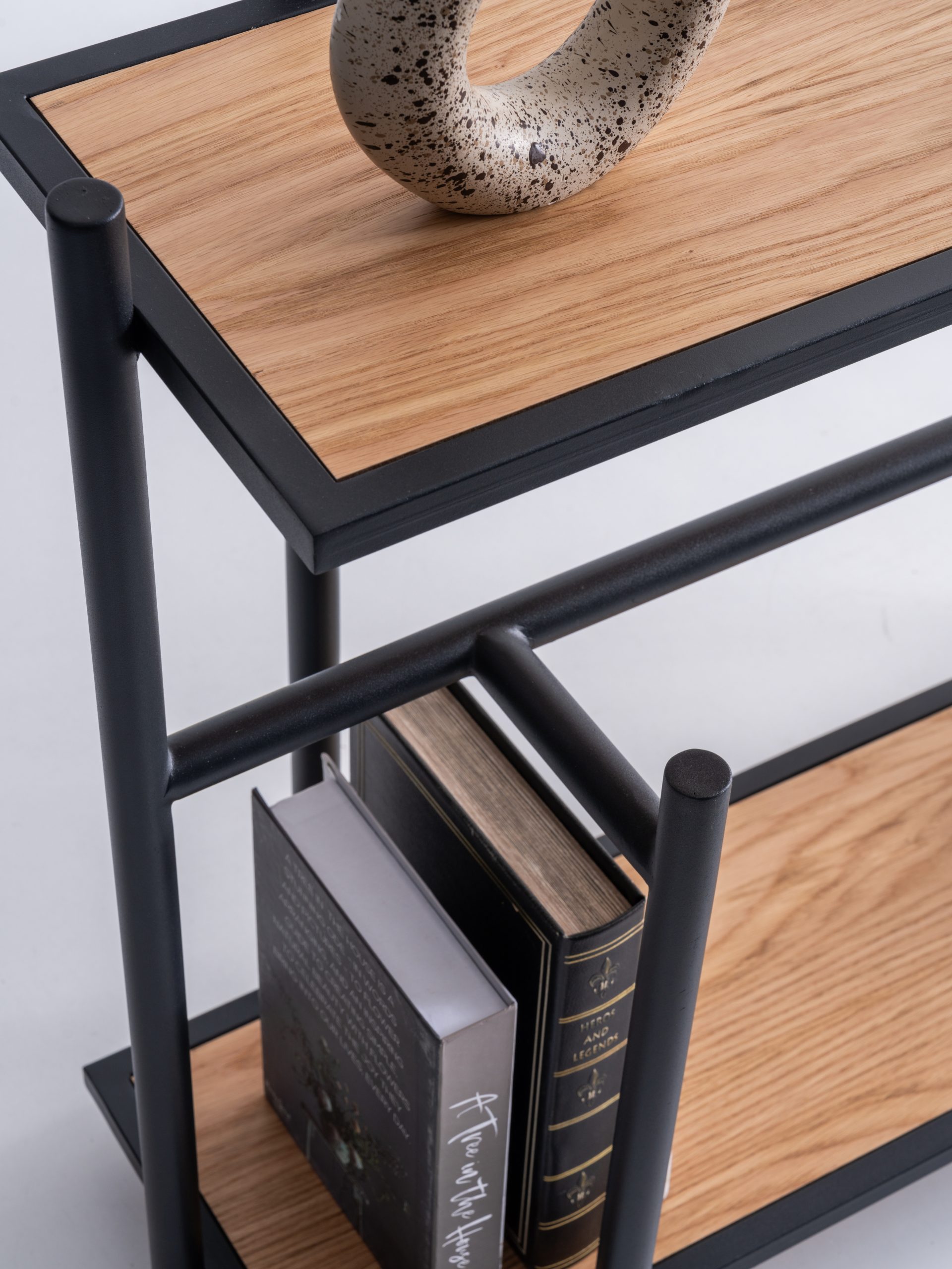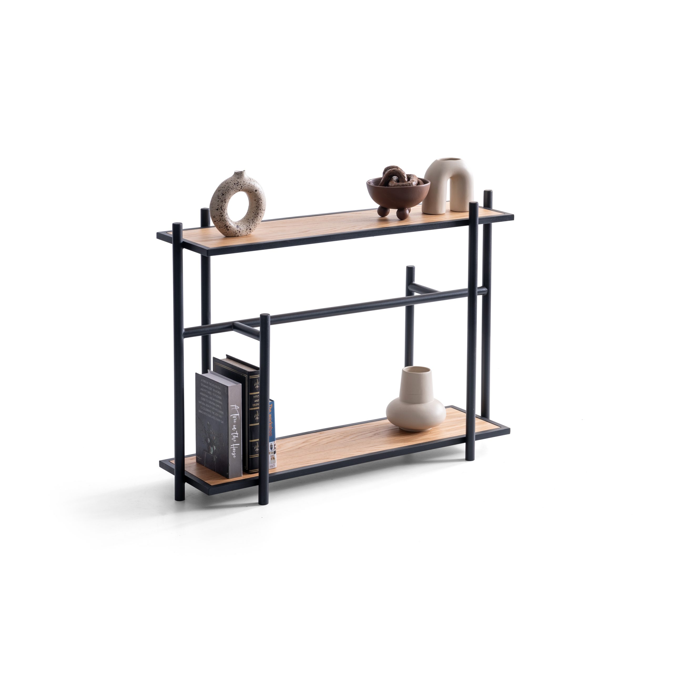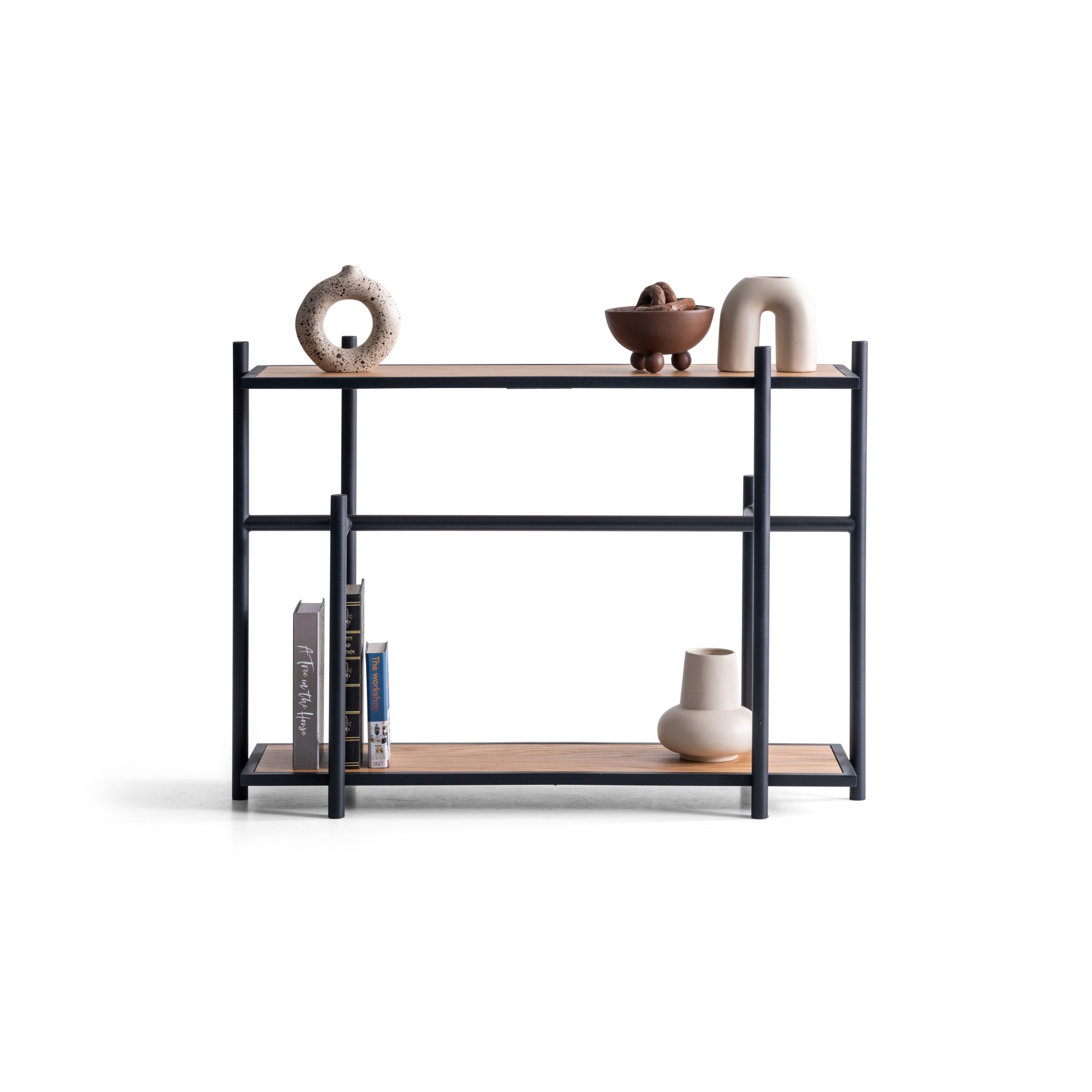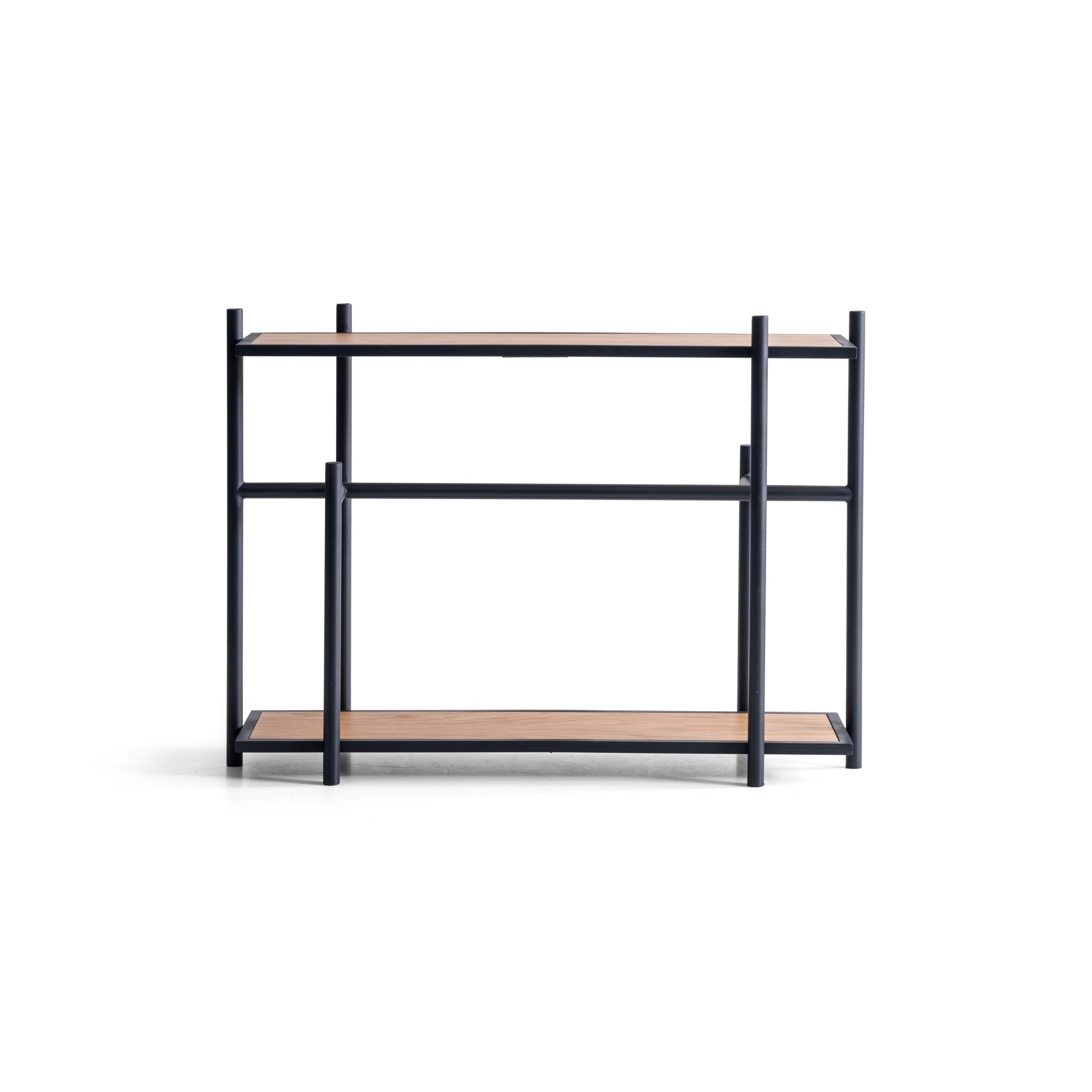 Cu o structură metalică neagră și rafturi din lemn natural, această piesă minimalistă este ideală pentru organizarea cărților, obiectelor decorative sau a plantelor de interior.
