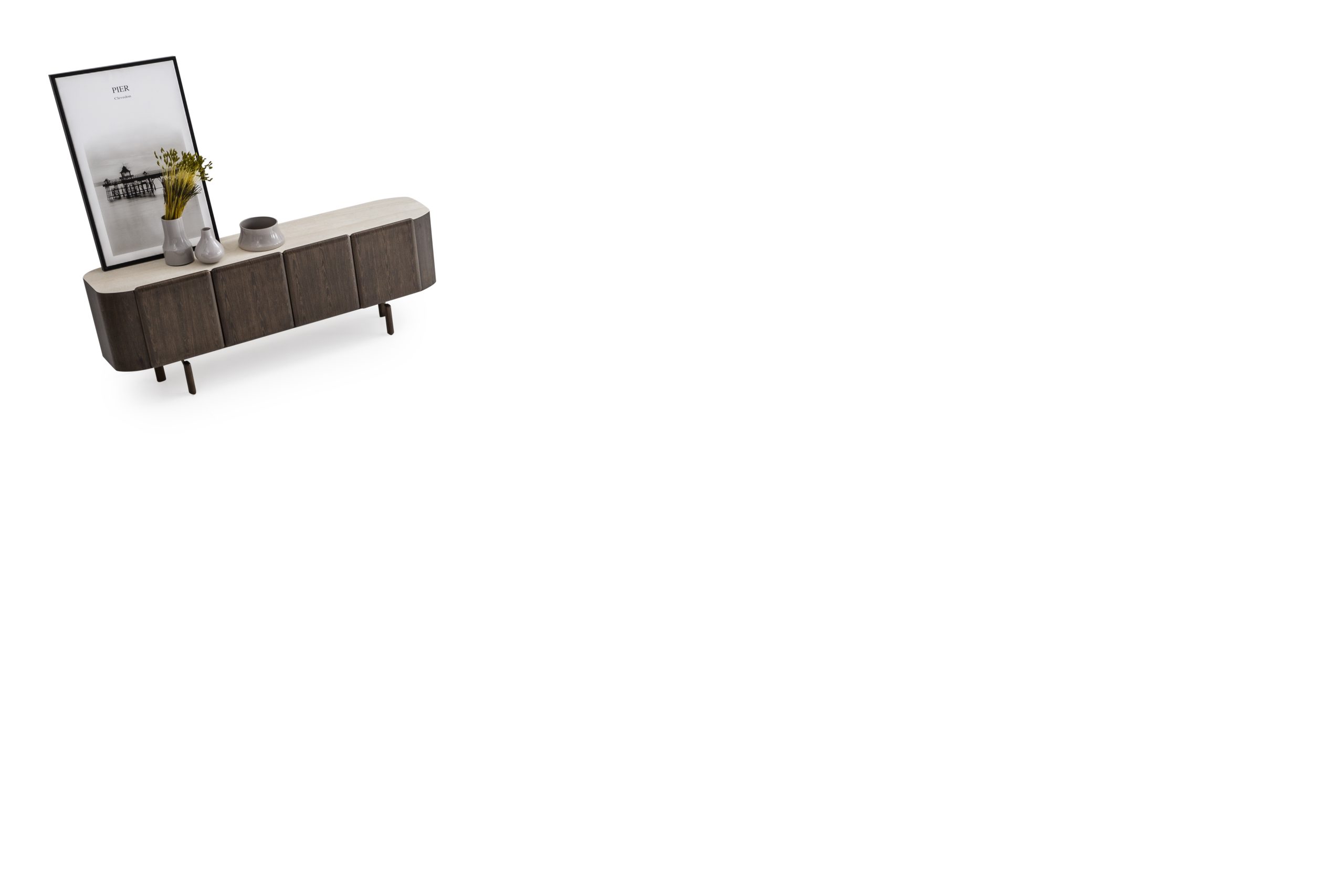 Această piesă de mobilier este un adevărat manifest al eleganței moderne. Se remarcă prin designul său echilibrat, care îmbină sobrietatea lemnului natural cu accente contemporane. Formele geometrice curate sunt puse în valoare de uși cu muchii rotunjite .