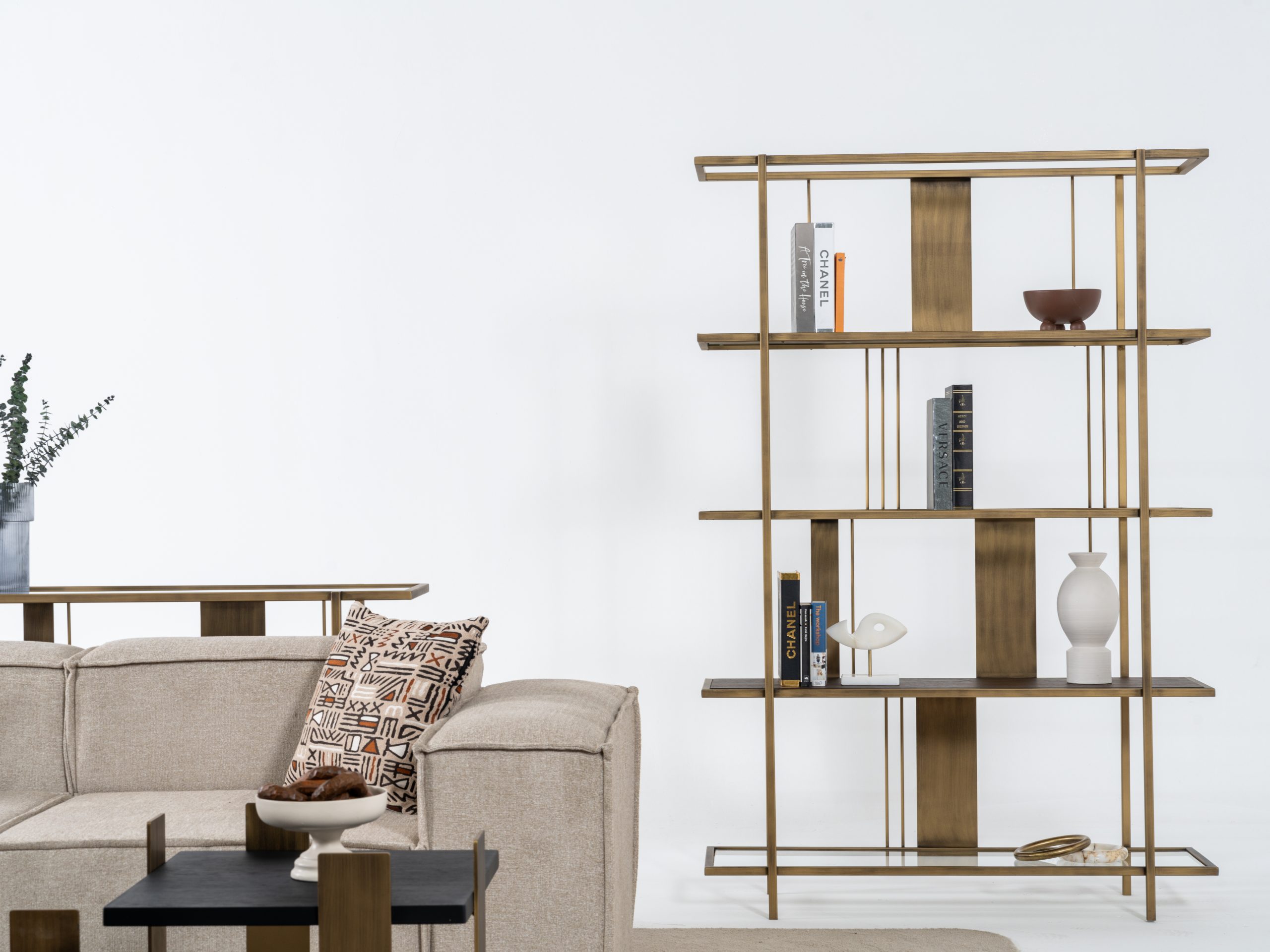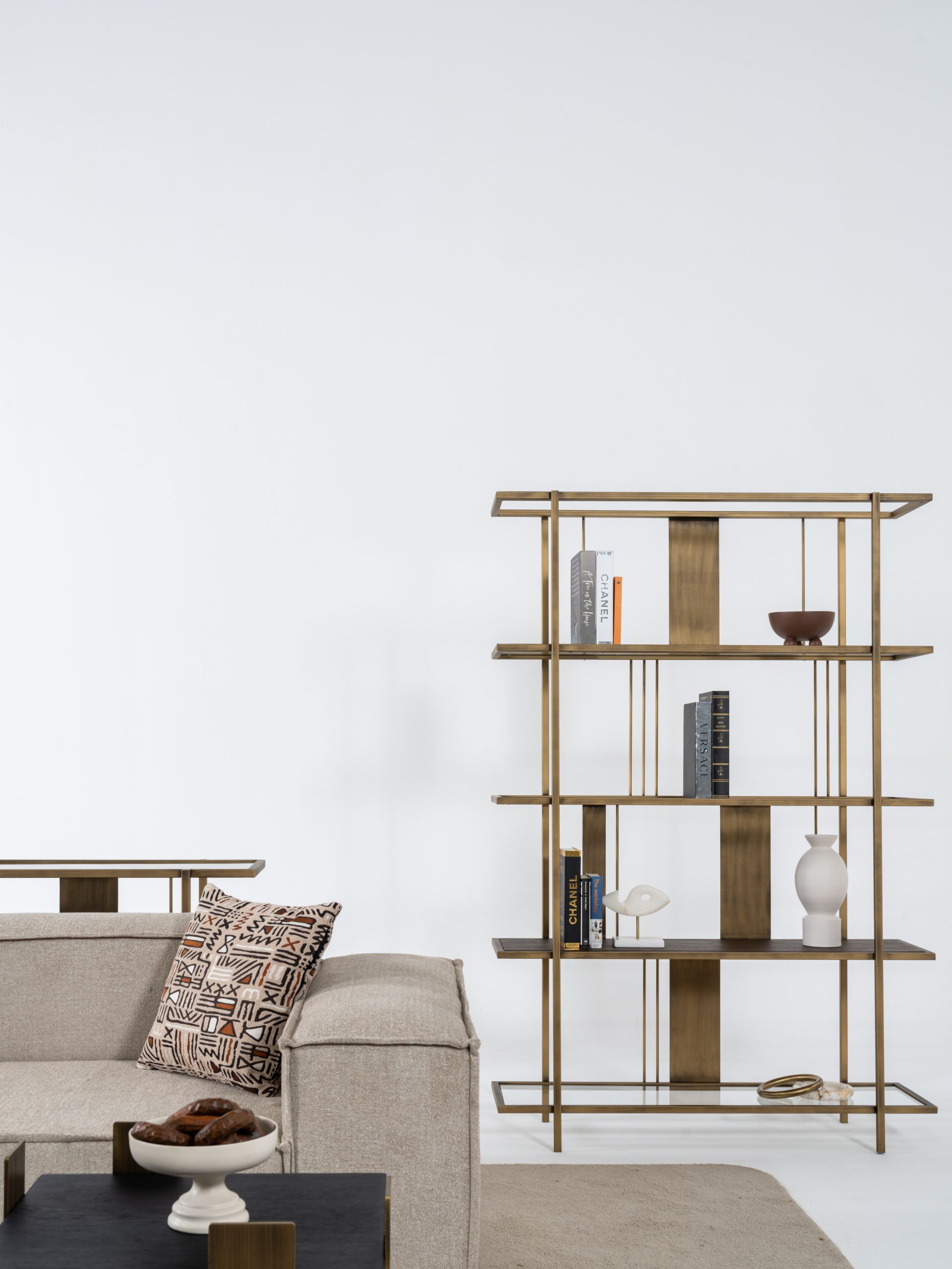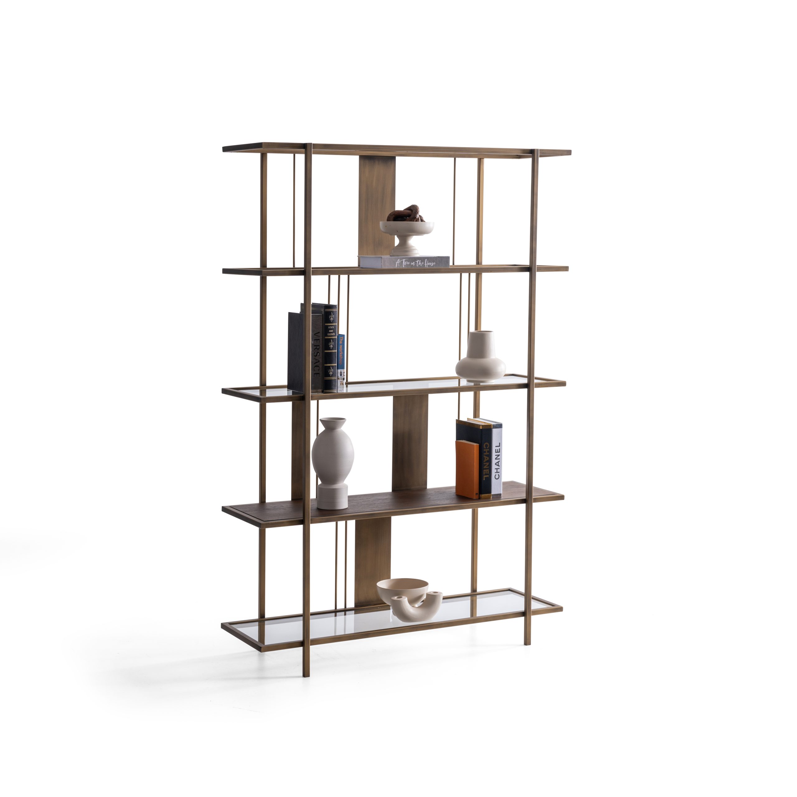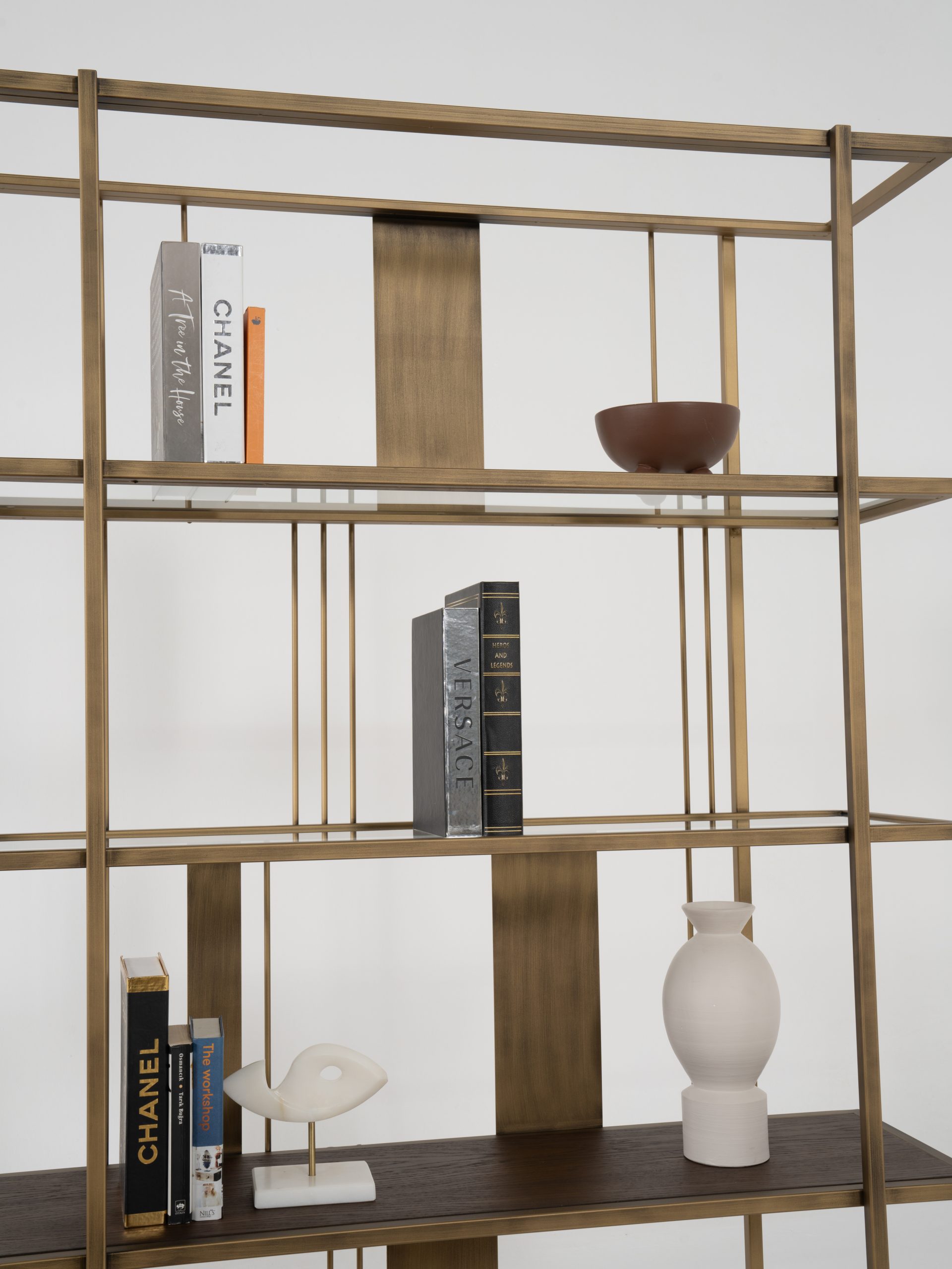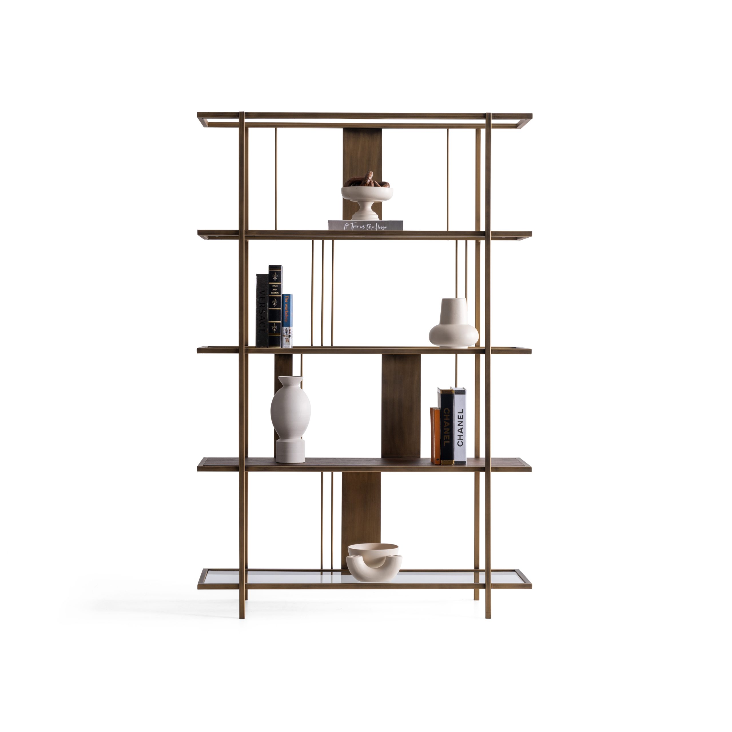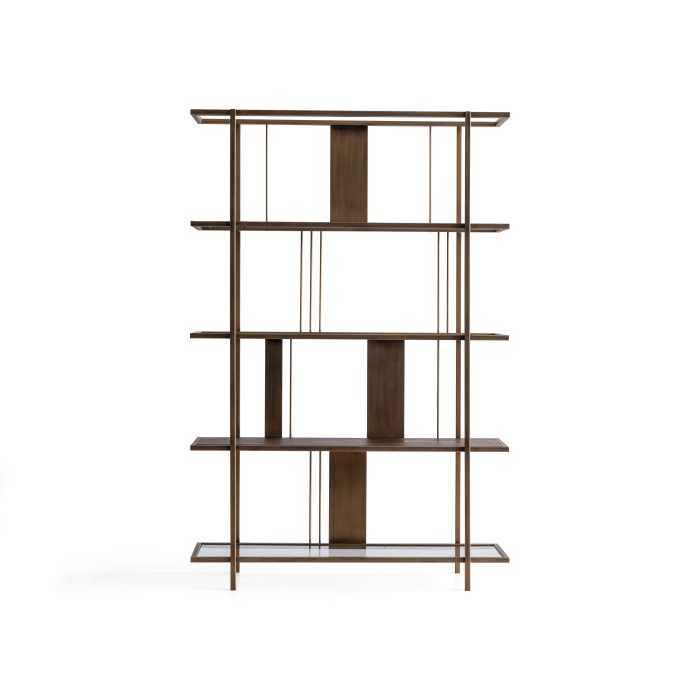 Etajera Macha îmbină armonios minimalismul cu rafinamentul industrial, fiind o piesă de mobilier ideală pentru spațiile moderne. Structura sa metalică în nuanțe de bronz antichizat, alături de elementele verticale subțiri și panourile centrale, creează un joc vizual echilibrat și captivant. Rafturile late oferă suficient spațiu pentru depozitarea cărților, obiectelor de artă sau plantelor decorative, transformând etajera într-un punct focal al încăperii.