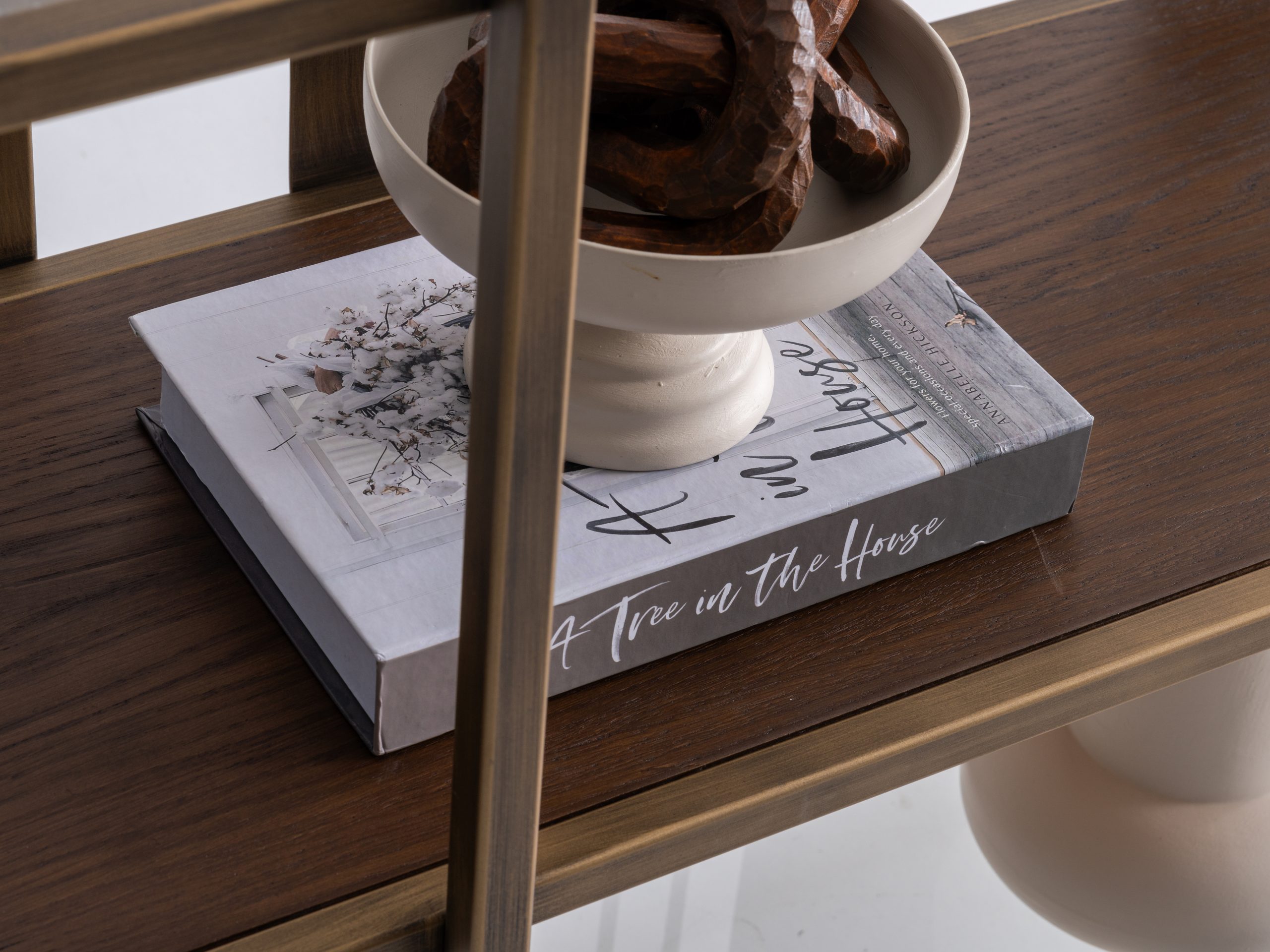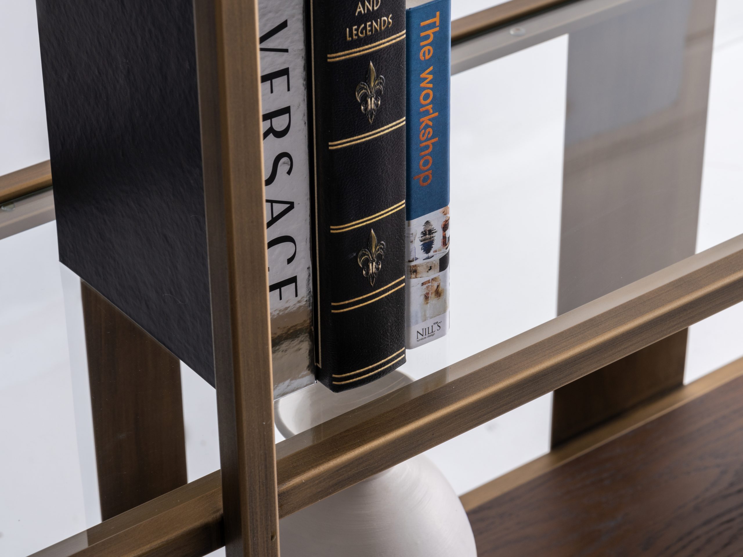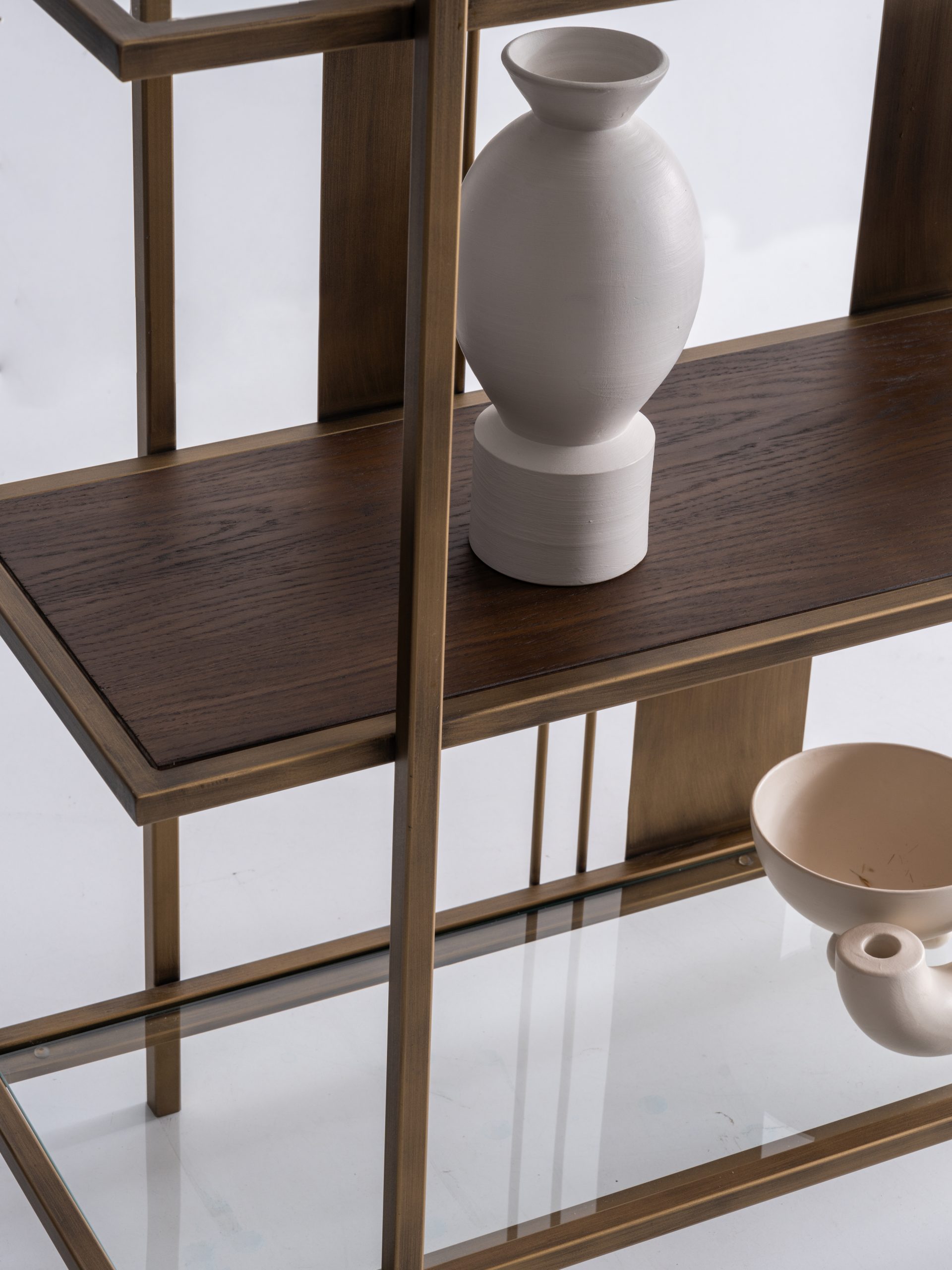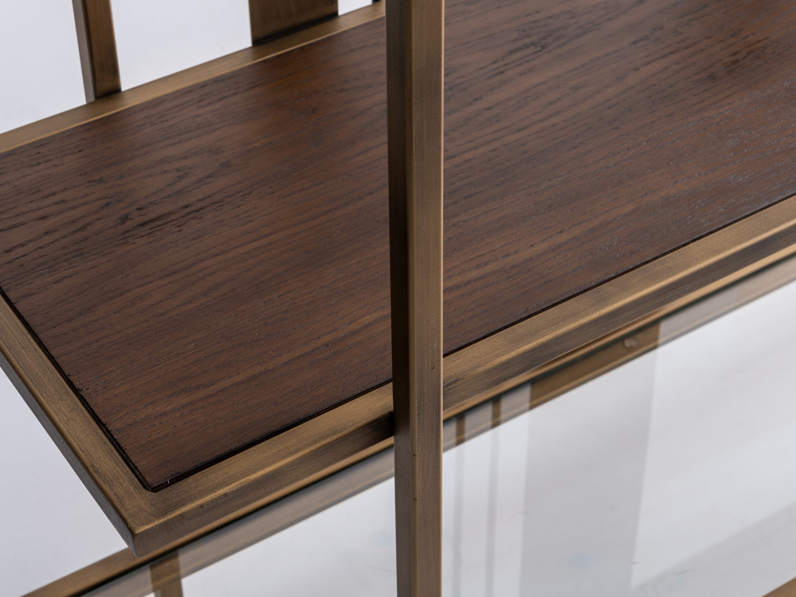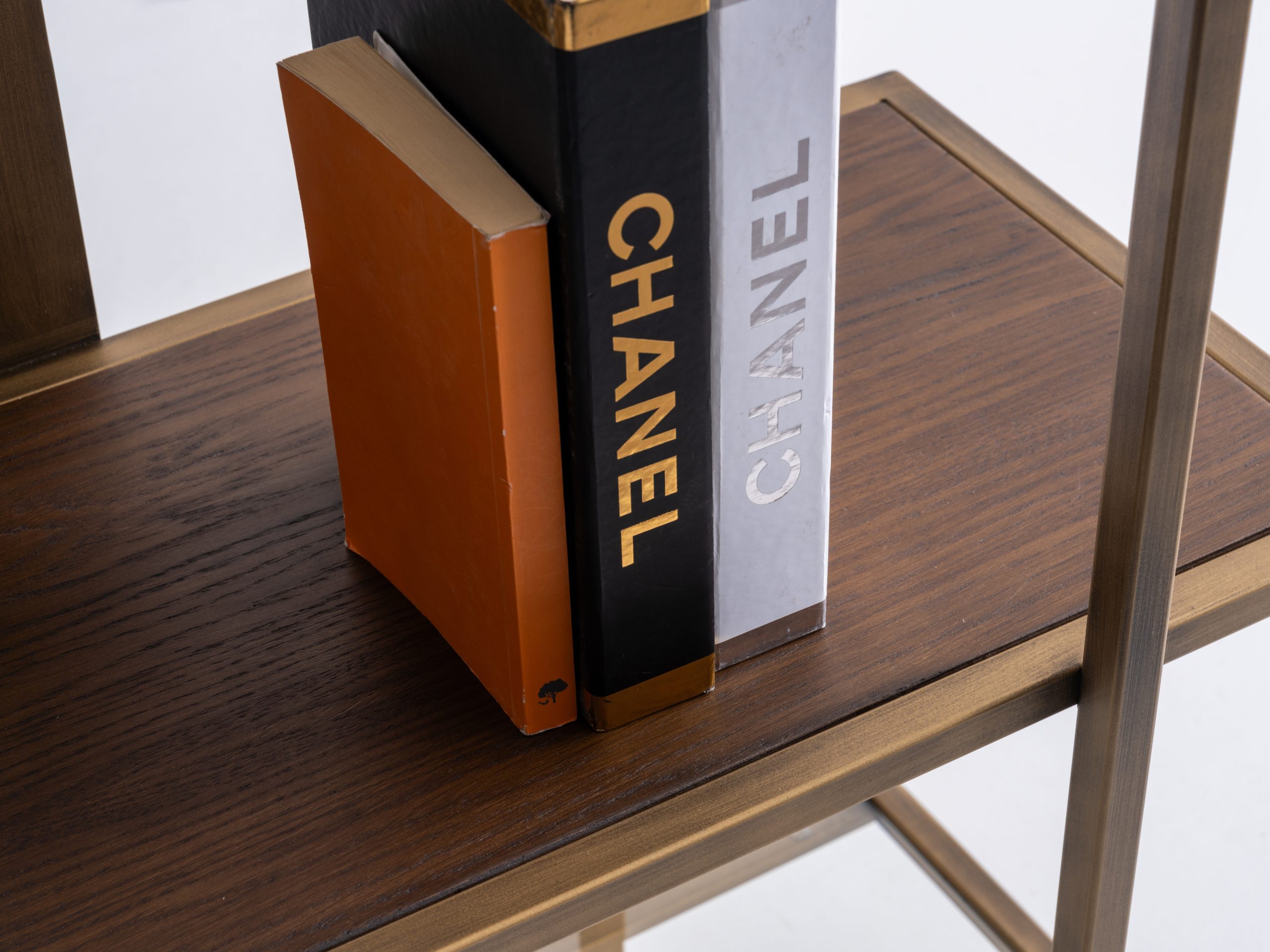 Etajera Macha îmbină armonios minimalismul cu rafinamentul industrial, fiind o piesă de mobilier ideală pentru spațiile moderne. Structura sa metalică în nuanțe de bronz antichizat, alături de elementele verticale subțiri și panourile centrale, creează un joc vizual echilibrat și captivant. Rafturile late oferă suficient spațiu pentru depozitarea cărților, obiectelor de artă sau plantelor decorative, transformând etajera într-un punct focal al încăperii.