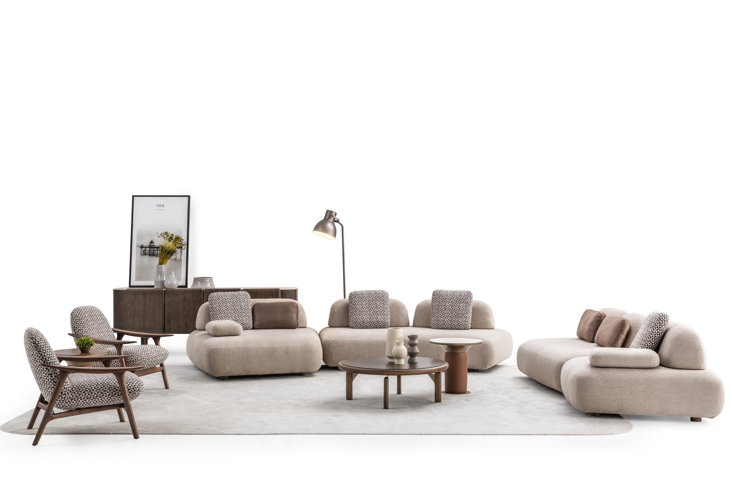 Design mid-century: inspirat de stilul anilor ’50-’60, cu o siluetă curbată, picioare conice și brațe din lemn masiv.