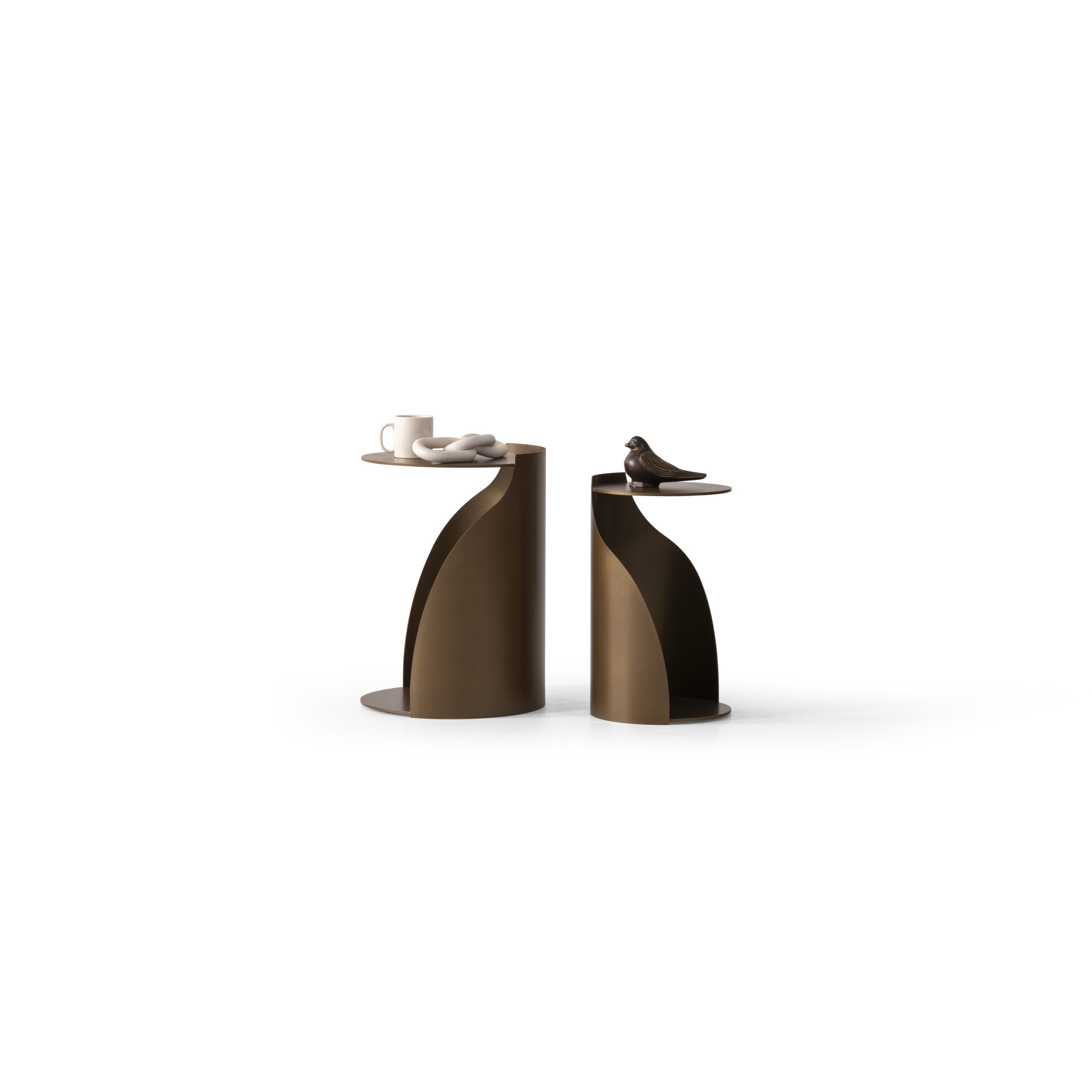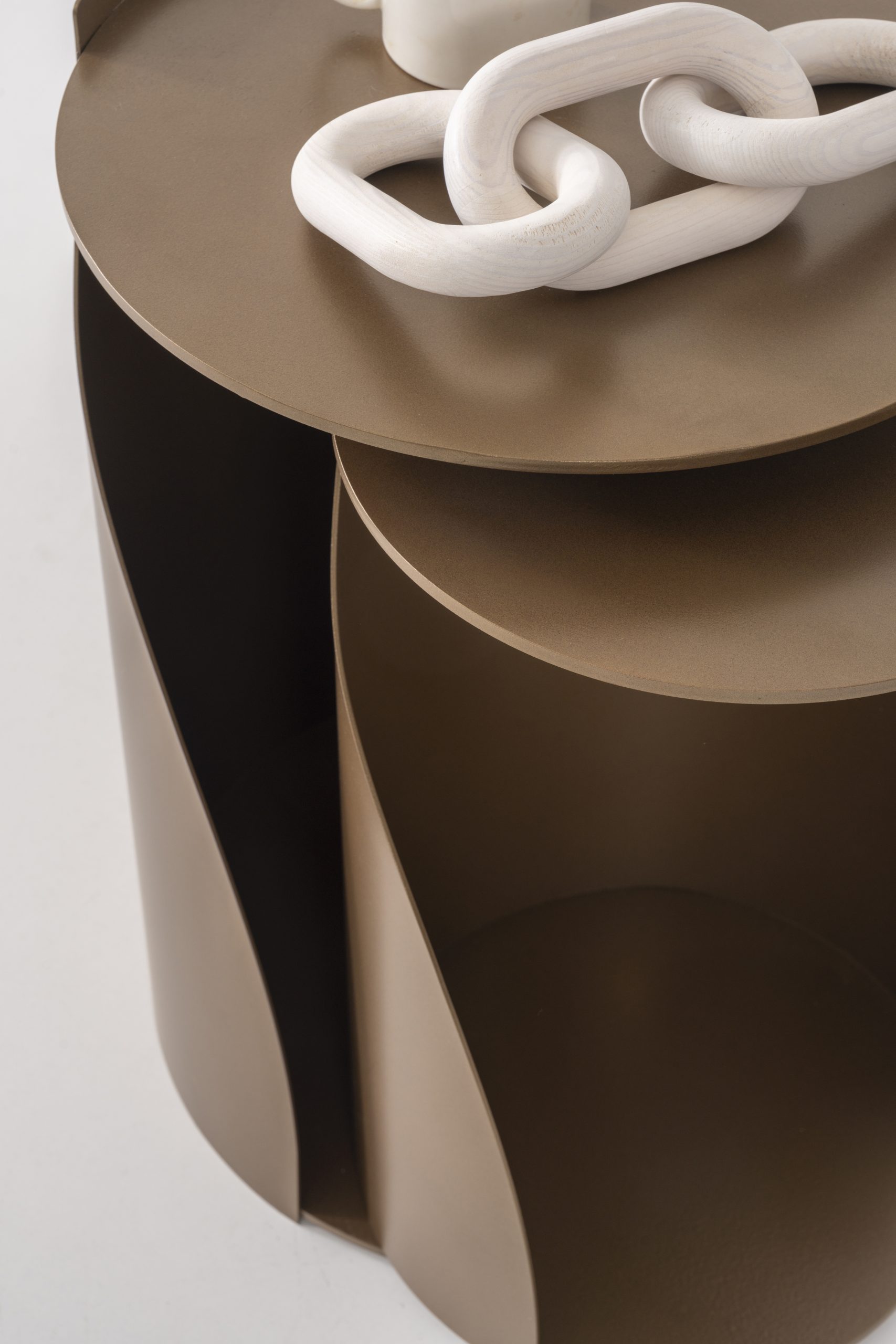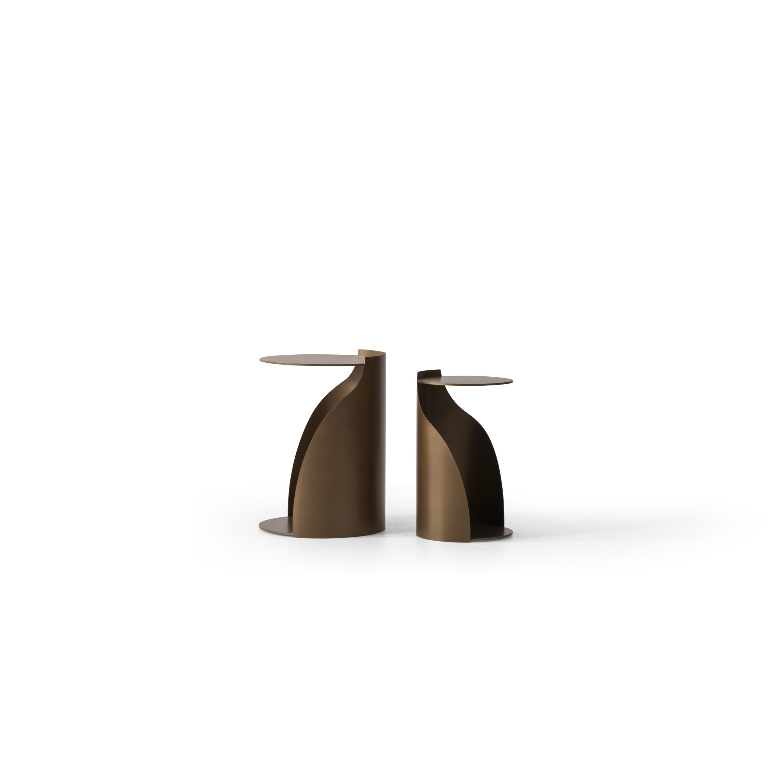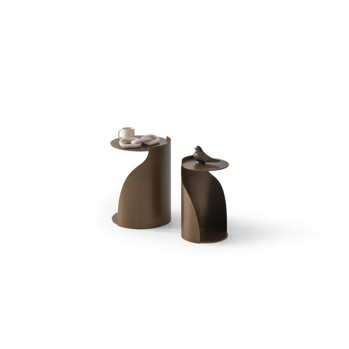 Belinda este un set de măsuțe laterale cu un design îndrăzneț și arhitectural, în care formele circulare și volumele curbate se îmbină într-o compoziție fluidă și modernă. Realizate integral din metal, aceste măsuțe surprind prin echilibrul dintre funcționalitate și expresivitate vizuală.