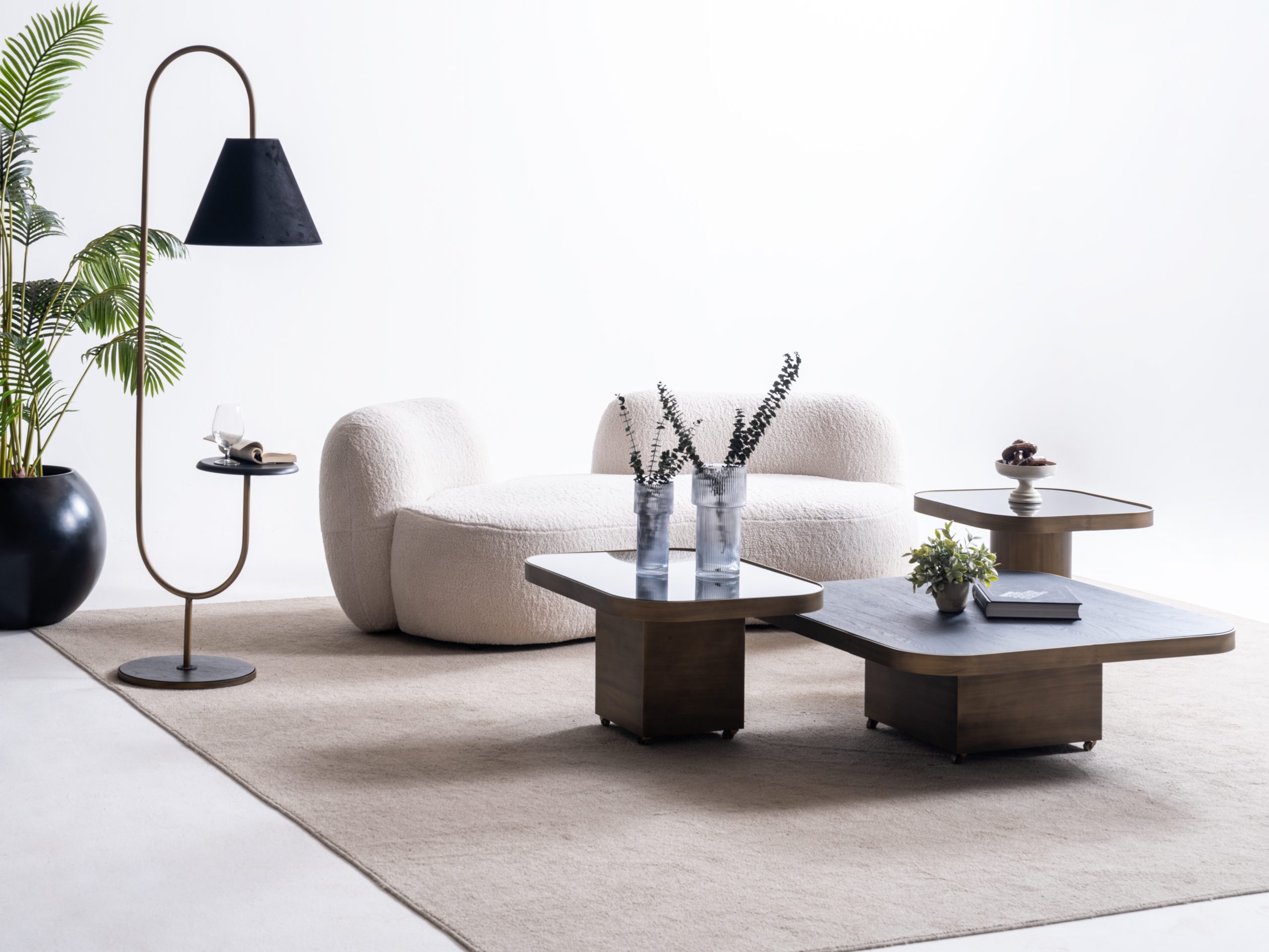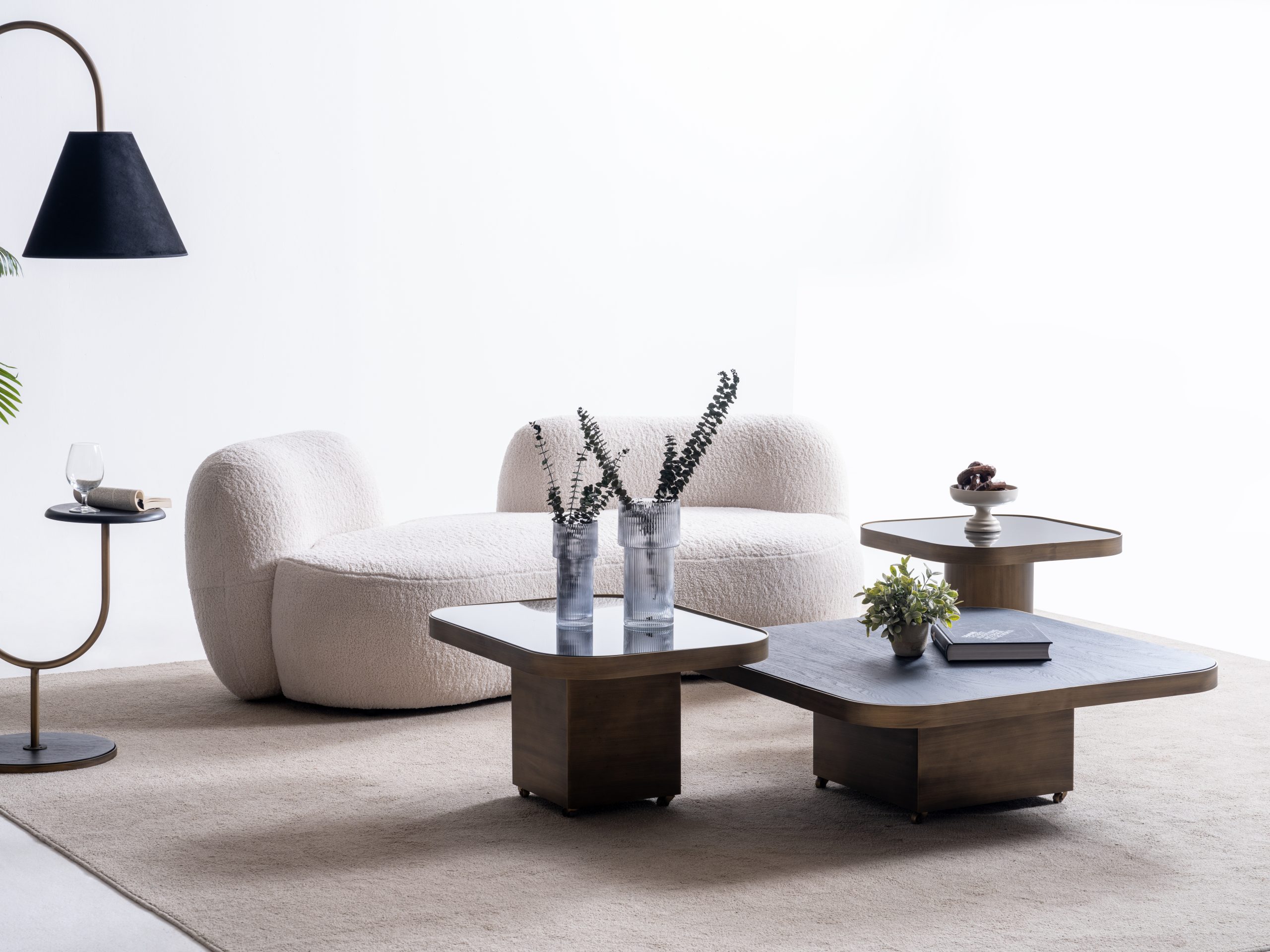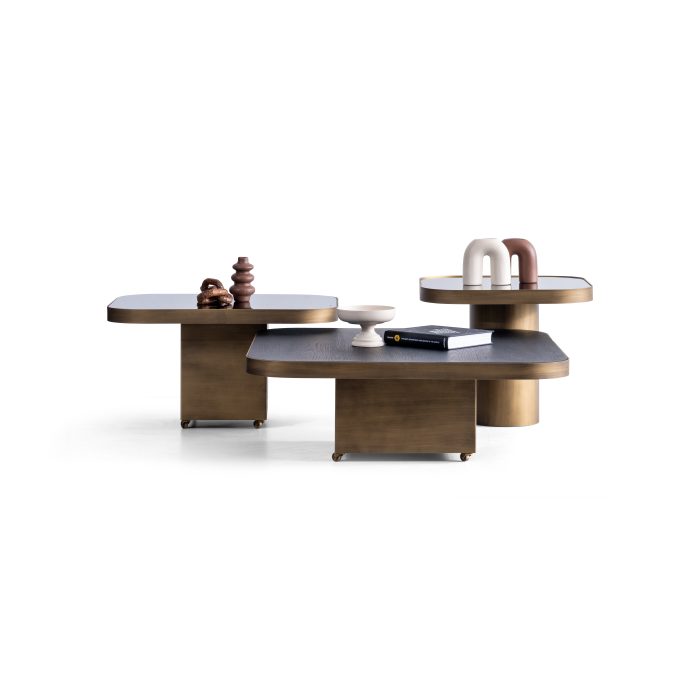 Setul este format din trei măsuțe cu înălțimi și dimensiuni diferite, ce pot fi dispuse individual sau grupate într-o compoziție unitară – adaptându-se cu ușurință atât în spații largi, cât și în livinguri compacte.